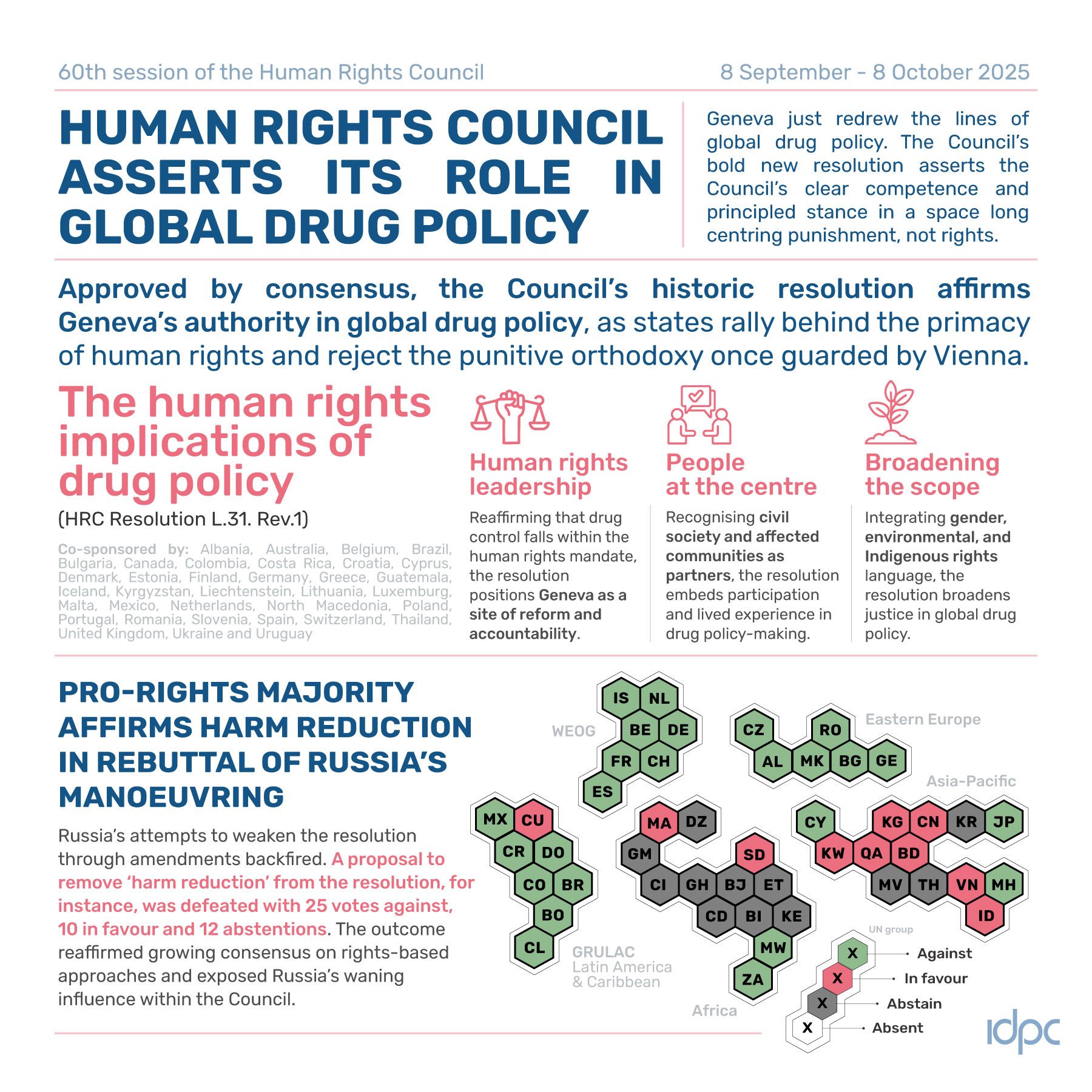 This is the fourth HRC resolution dedicated to drug policy and human rights. The first three, adopted in 2015,2018and 2023, aimed to feed into drug policy processes taking place in New York (around the 2016 UNGASS) and Vienna (2024 midterm review). This time, the objective was to separate the work of the HRC from processes outside of Geneva, and to assert the independent role of the Council to address the human rights impacts of drug policy.